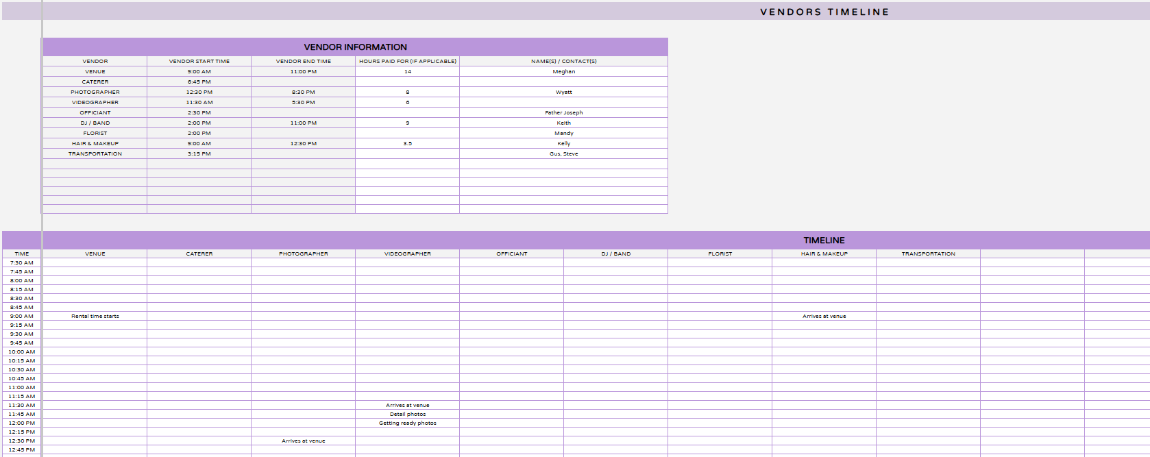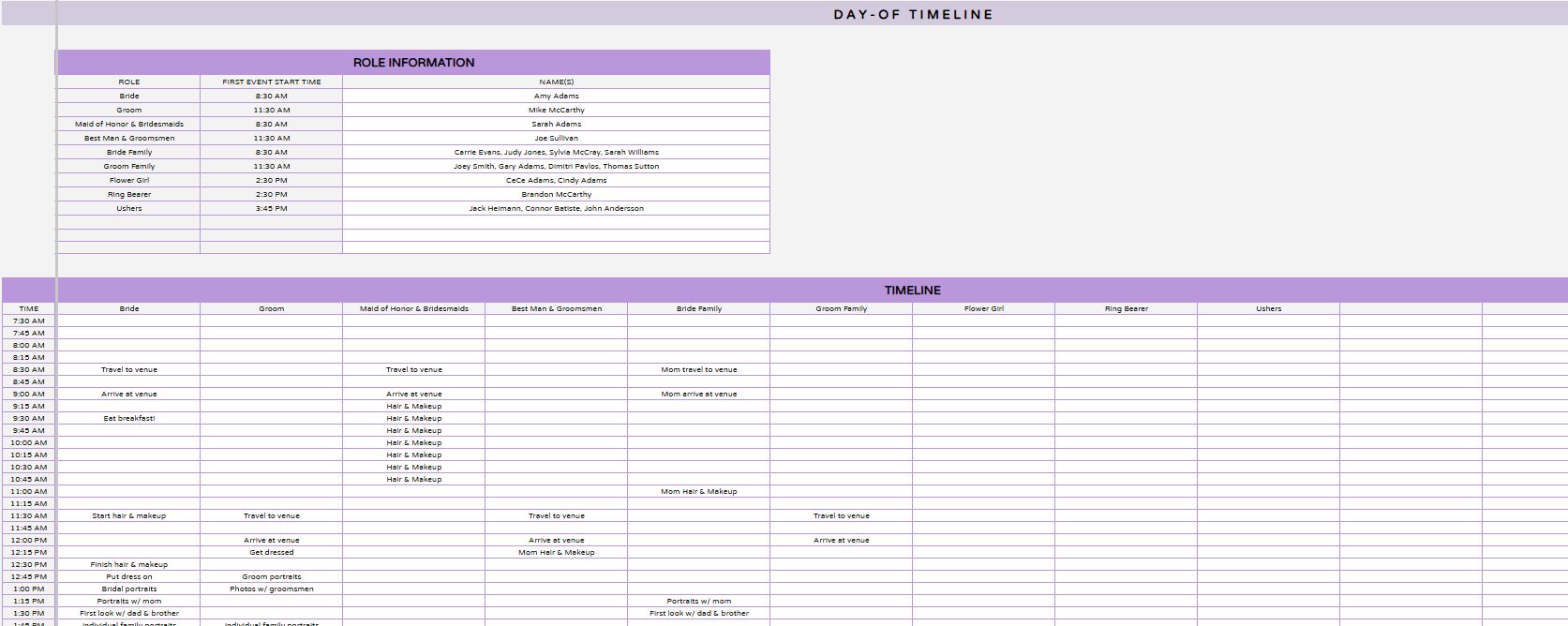 Be Your Planner Day-Of Timelines Spreadsheets provide a detailed schedule for all your vendors and loved ones, ensuring everyone knows exactly where to be and when throughout your wedding day. Designed to keep your celebration running smoothly, these spreadsheets help coordinate every moment with precision, reducing stress and allowing you to enjoy your special day confidently.